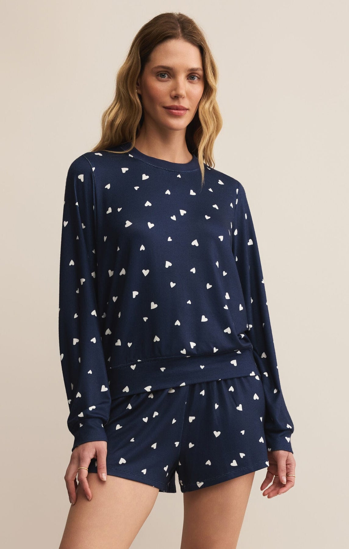The Classic Heart Long Sleeve Top features a crew neckline and long sleeves. This lightweight top is made in a very soft wash fabric and pairs well with Classic Heart Jogger. Regular fit Silky Pointelle: 95% Polyester 5% Spandex Length from shoulder is 22"