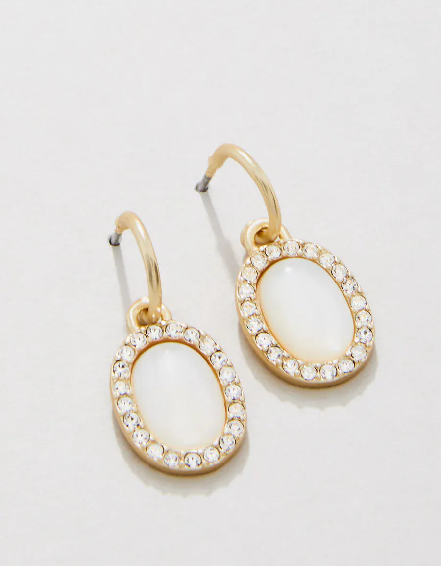 Elegant and versatile, the Oval Halo Drop Hoop Earrings add a soft shimmer to any look. Featuring luminous mother-of-pearl pendants framed by a delicate halo of sparkling glass crystals, these lightweight earrings are finished in lustrous 18kt matte gold plating for timeless appeal. Designed with removable drops, they easily transform into classic gold hoops — giving you two beautiful styles in one.
