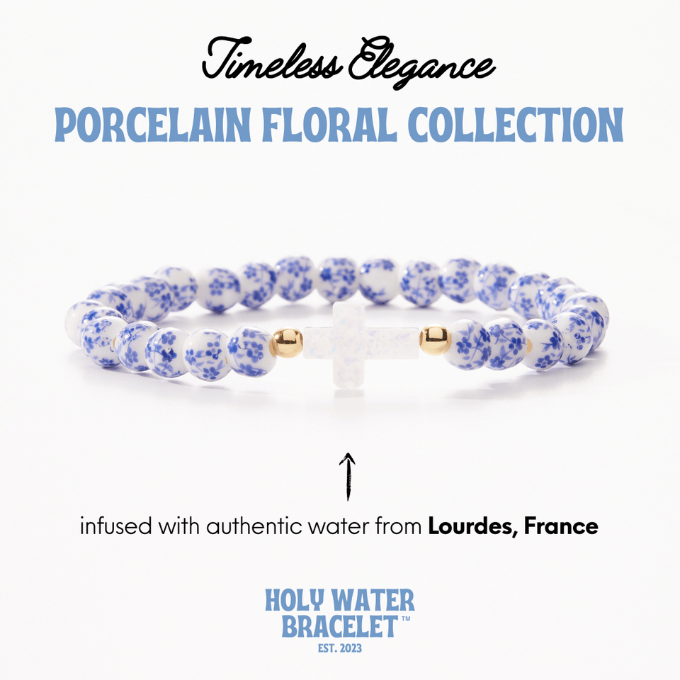 Discover the timeless beauty of our porcelain floral collection, where tradition meets contemporary style. Crafted with 6mm porcelain beads featuring a blue blue floral pattern and featuring our signature cross infused with authentic holy water sourced directly from Lourdes, France.