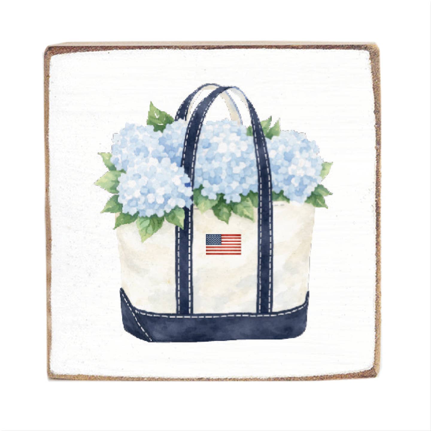 - Wooden block sign with hydrangea tote and flag design 6 x 6 x 2"